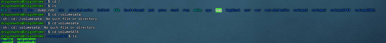 接下来需要通过SSH登录到群晖,进入跟踪路径,找到当前挂载的盘符,这个时候可以看到外接的硬盘已经被挂载到了/volumeSATA/目录下。