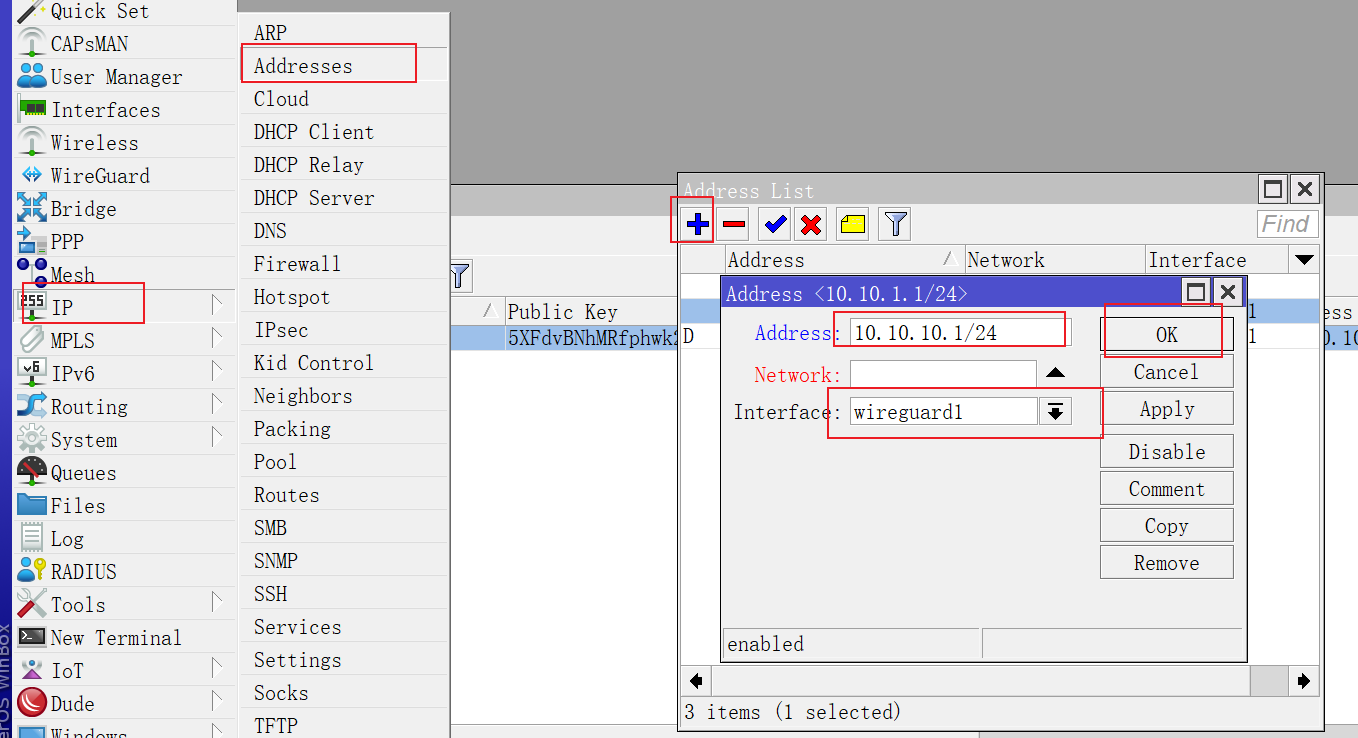 在routeros的IP---addresses中创建一个新的地址,这个10.10.10.1/24是我们要分给wireguard1的内网地址,可以大家随便,不要和自己的内网地址冲突就行,interface选wireguard1。