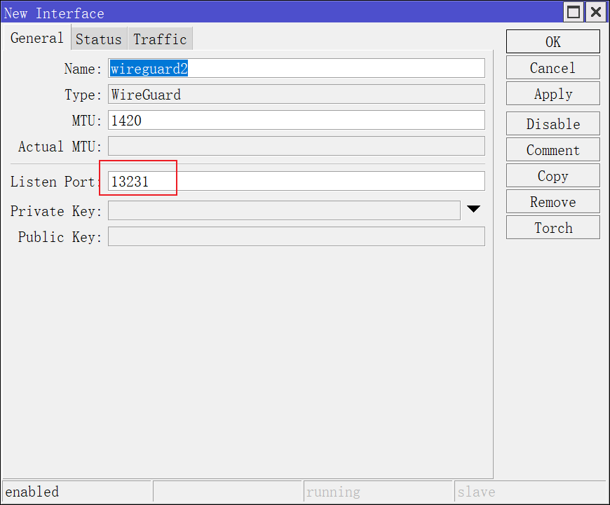 随机生成一下监听端口,比如8423,然后点击OK,创建后会生成wireguard的公钥。