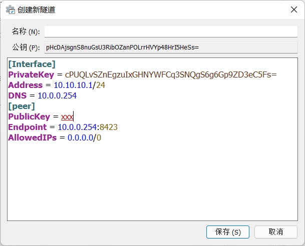 1、routeros的wireguard1接口的公钥填windows版wireguard中peer节点的公钥位置;