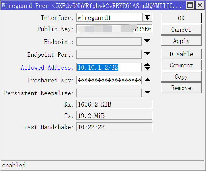 在routeros的wireguard接口创建一个peer节点,填上windows版wireguard自动生成的公钥在public key栏中。allowed address允许地址中填上10.10.10.2/32,这个10.10.10.2是我们分给客户端windows版wireguard的地址。